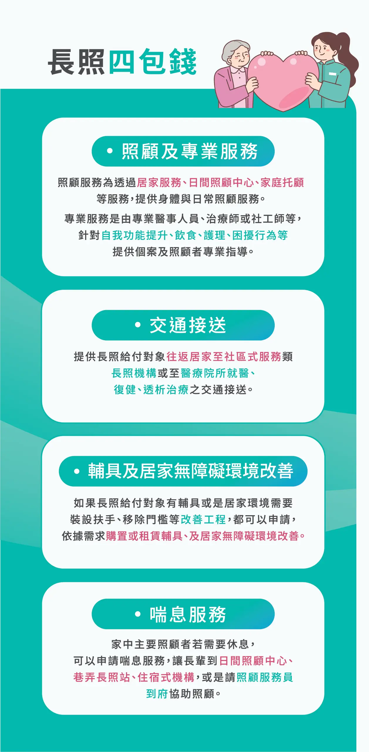 提供特約與自費的各項長照項目,針對長照的四個面向提供多項服務選擇,包含照顧及專業服務、交通接送、輔具及居家無障礙環境改善、喘息服務。