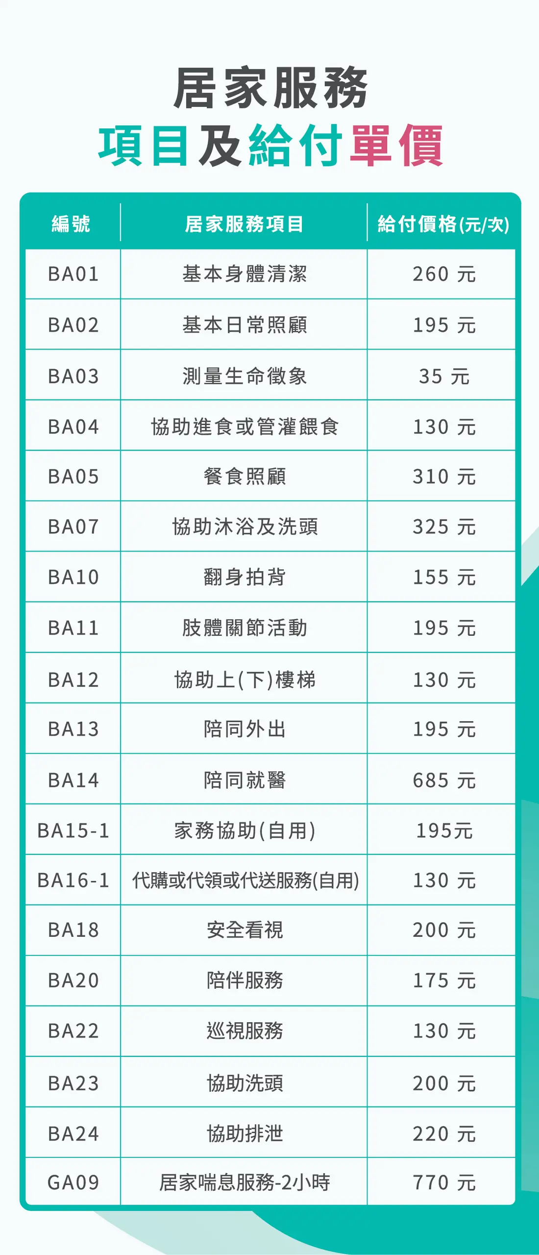 - 居家照顧 (居照): 由專業訓練的照服員提供身體清潔、餐食照顧、協助上下床、陪同外出、家務協助等全方位生活支持。